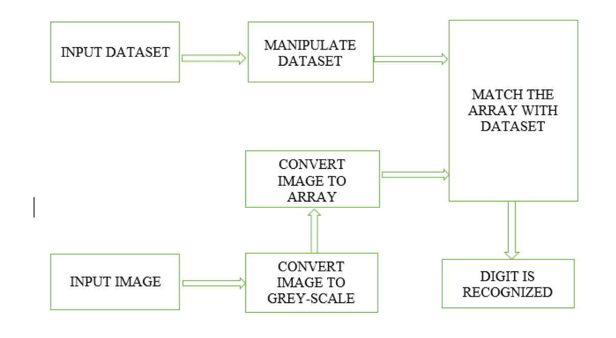 The dataset is imported. The matrix of each image in the dataset are stored in arrays. Then the image is taken as input. Pre-processing is done such that the image is converted to grey-scale image. Then the image is converted to array and is matched with the arrays of dataset. Thus, the digit is recognized.